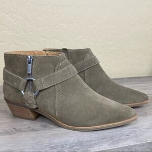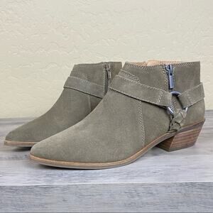Throw on this pair of ankle booties for the perfect finishing touch to any outfit—featuring a suede upper, metal accents, and a stacked wood heel.