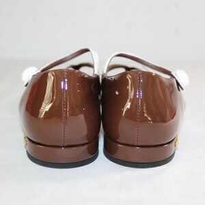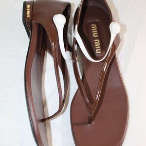 NWOB MIU MIU Mary Jane Flats Thong Sandals Ankle Strap Brown Patent 37.5