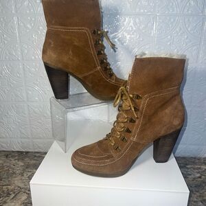 Step out in style with these chic brown suede ankle boots. Featuring a cozy faux fur lining, they offer both warmth and elegance. Perfect for any occasion.