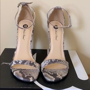 Michael Antonio Jaxine grey snake print sandal with ankle strap. New and comes with original box.