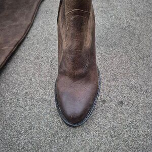 Brown distressed leather boots from Musse & Cloud. Thick leather upper with intentional patina. Stacked heel. Partial side zippers. Kind of a minimalist or streamlined take on the cowgirl boot. Perfect contrasted with a floaty, feminine dress. New without box.