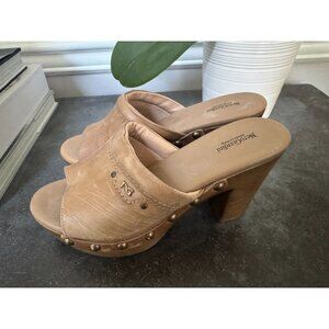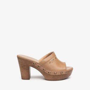 Leather clogs on a wood effect background with 3.5" heel and 1" platform. Decorative bolts for a trendy and retro look