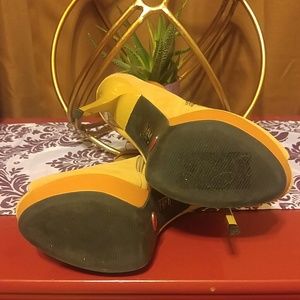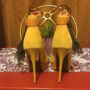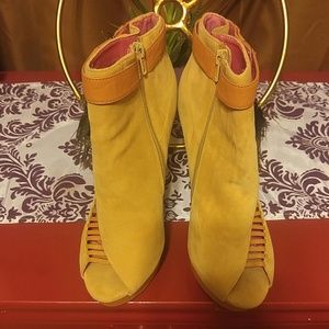 Light & dark tan colored booties with a pink lining. Material is faux suede/nubuck and faux leather. Cutout detailing. Feather tassels. Inside ankle zipper for fast on/off. 6" heel, 1.25 platform. Can also fit a sz 9.5. Never worn. Sorry no box. Open to offers.
