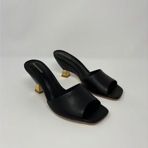 NWOB Reformation Gerri Heeled Sandal Mules in Black Leather Gold Heel, 6.5