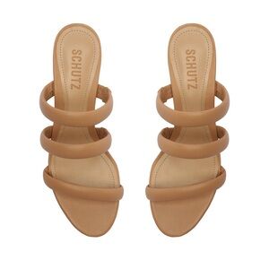 NWOB Schutz Women’s Olly Mid Block Nappa Leather Sandals in Honey Beige
