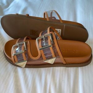NWOB Schutz Naomi sandals. Adjustable straps and a translucent upper add modern elements to a weekend-ready slide sandal set on a contoured footbed for a customized fit. Size 6B.