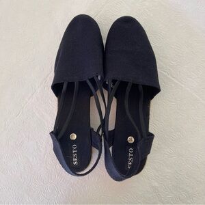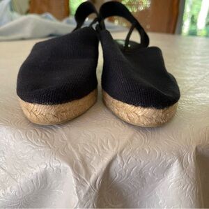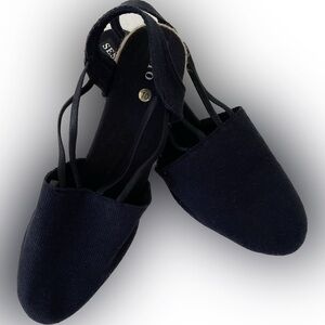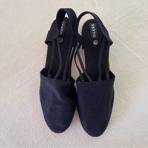 NWOB Sesto Meucci Black Canvas Espadrilles Made in Spain 10. Closed-toe black canvas upper. Canvas footbed. Rubber, no-slip outsole. 1 3/4” wedge heel. Elastic connector straps on top. Canvas, non-stretch back strap. No box.