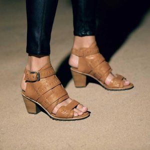 Brand New Sorel Nadia Buckle II Leather Bootie Sandal in a neutral tan/camel. Size 6.5. An open counter, cutouts and a peep toe add season-spanning versatility to a chic bootie set atop a stacked block heel and a lugged sole. - Open toe - Adjustable ankle strap with buckle closure - Memory-foam-cushioned EVA footbed - Block heel - Approx. 3" heel - Grip sole - Leather upper and lining, manmade sole - Condition: New without box, hence may show minor signs of wear from in-store handling/try-ons