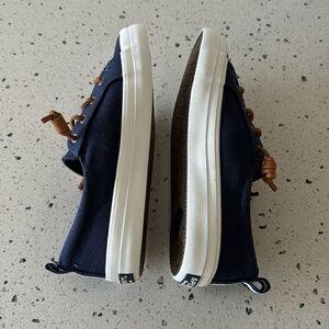 Pre-tied leather laces give this canvas sneaker a signature preppy look and a fast, easy fit. Embrace its nautical side by pairing it to a striped top and denim or simply wear it with your favorite T-shirt and tights.