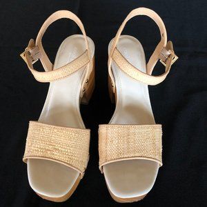 New without box, Steve Madden Cool Planet Rubyy Wooden Platform Sandals in size 8-1/2 in Natural Raffia. Retro-inspired height to dressy looks with studding at platform. Raffia with faux leather trim upper with man made sole and wooden block heel. Adjustable ankle strap with adjustable buckle closure, square-toe and cushioned foot bed. Made in Italy. So bummed they don't fit me. New without tags or box and in excellent new condition. I'm usually a shoe size 8 to 8-1/2 but I need my shoes a bit wider in the front. These are super cute, but are too narrow for my bunions.
