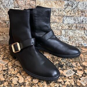 NWOB | Stuart Weitzman Black Leather Ryder Lift Gold Buckle Bootie