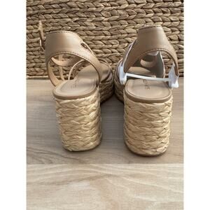 Strappy Wedge Sandals. Raffia Straw Wicker heel. Light brown Tan straps.