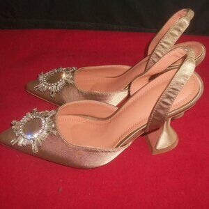 If you look at Amina Muaddi's Begum crystal-starburst-embellished slingback pumps, then look at these taupe-satin slingback crystal-embellished pumps there is NO difference even on the insole stitching and the crystal starburst's design. With the fabulous Muaddi-style heels these are gorgeous dress shoes that are new and unworn. With cushioned insoles and elastric behind the ankle [on the slingback strap] for comfort and rubber-reinforced heels. Marked 7. Heel 3.75" Width 3& 1/8" Insole 9.5" (Retail for the actual Begum is $980-$1275.) (Note: pic of authentic blue-satin Begum is just FYI and is not for sale)