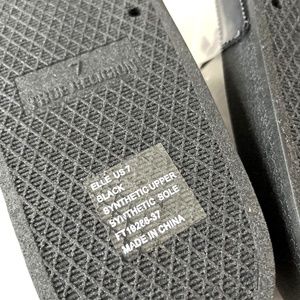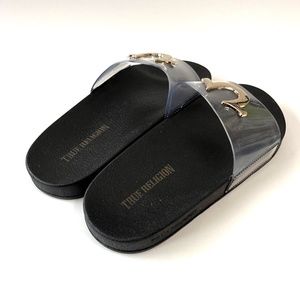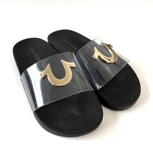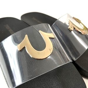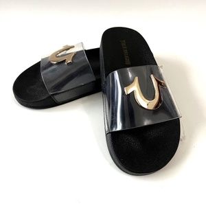 NWOB True Religion Elle Clear Slide Sandals Black Gold Logo