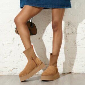 The Classic Dipper features a calf-hugging neoprene shaft above the soft suede upper. Functional side zippers allow for easy on-and-off wearability, and a leg-lengthening platform gives it a high-fashion boost. It's lined with our beloved UGGplush™ upcycled wool blend for that cozy UGG® feel and finished with a SugarSole™ outsole crafted from renewable, rainwater-nourished sugarcane instead of petroleum-based EVA. Wear with pants or jeans without fear of rumpling the hemline.