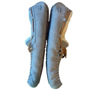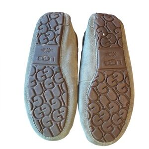 New Without Box UGG Dakota Pewter Suede Fur Slippers Women's Size 10 - Very Good Condition - Suede uppers with moccasin stitch detail around toe - Leather lace detail