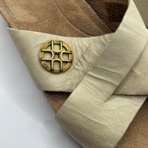 Experience the perfect blend of style and comfort with these UGG tan wedge sandals. Featuring a cork wedge heel and crisscrossing straps, these shoes offer a natural, earthy look ideal for casual outings. The open toe design ensures breathability, making them a great choice for warm weather.