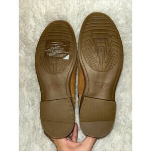 Brand new and never worn Ugg Australia Pure solid medium brown suede with ivory sherpa trim ankle height booties. Features rounded toe and full coverage through tie, foot sides, heel back and ankle shaft height. Visible stitching with ivory sherpa trim throughout. Zip closure along inner shaft profile. Soft. Rushed inner lining. Lightly padded inner sole. Light tread on flexible rubber lower outer sole with .75” block style heel height. Women’s size 5. Please note that Ugg runs a bit large, fits more like a 6.5, in my opinion. Never worn, but sorry, box not available