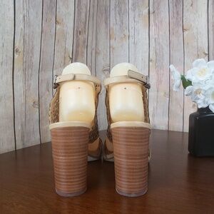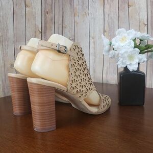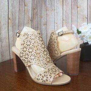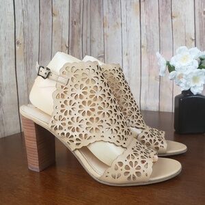 Nude color. Laser cut floral perforation. Flirty cut outs at toe, instep and ankle. Chunky stacked 3.5” heel. Leather upper, lining and sole.