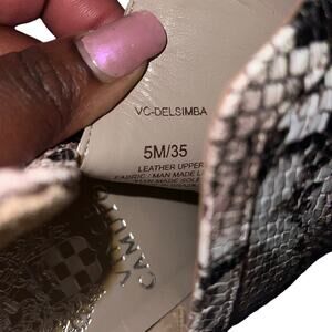 These Vince Camuto Delsimba ankle booties in a chic snakeskin print are new without box and in excellent condition. Crafted from high-quality leather with a back zipper closure for easy wear, these boots feature a stylish almond toe and a sturdy block heel for added comfort and height. The 4" heel makes these booties perfect for elevating any outfit, whether casual or dressy. Size US 5 (EU 35, UK 2.5, AU 3). Never worn.