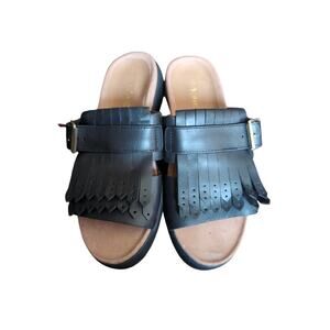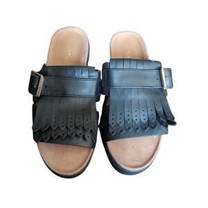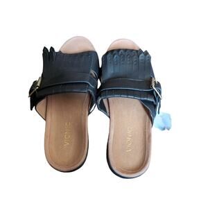 Elevate your shoe collection with these stylish and comfortable Vionic Splendid Fillmore sandals. Crafted from high-quality black leather, these slip-on sandals feature a solid pattern with fringe and buckle accents that add a touch of elegance to any outfit. The flat heel style with arch support and adjustable straps provide comfort and support for all-day wear.