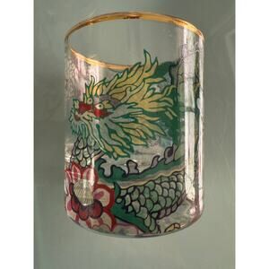 decorated with Schumacher's Chiang Mai Dragon pattern, inspired by an Art Deco print, crafted of fine clear glass and hand-painted with 24k gold accents.