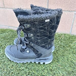 Never used boots in great condition just has been stored for a long time. Get ready to brave the winter in style with these black Silverspun Lace Up boots from Merrell. Perfect for casual occasions, these boots feature a round toe shape and lace-up closure for a secure fit. The boots are made with a combination of suede, nubuck leather, and wool fabric, making them both waterproof and warm.