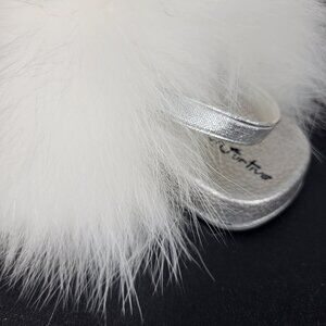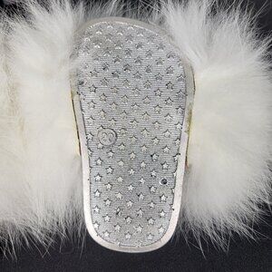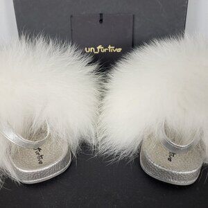 NWOB~$465~UN_FURTIVE~BABY~SZ 4.5/5~REAL WHITE FOX FUR SANDALS SHOES BOOTS~STUNNING THICK PLUSH GENUINE FOX FUR. SILVER METALLIC BODY. THE BOTTOM OF THE SOLE MEASURES 5 1/4" FROM THE TIP OF THE BIG TOE TO THE HEAL. THE FUR MEASURES 7" ACROSS THE TOP. SIZED A 20. FITS US SIZE 4.5 TO 5. GORGEOUS IN PERSON. THE BOX IS VERY LARGE SO THEY WILL BE SHIPPED WITHOUT THE BOX.