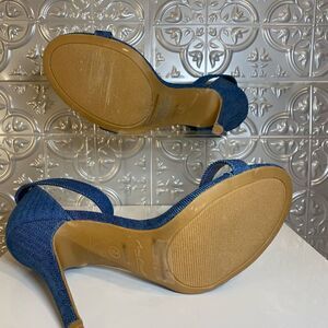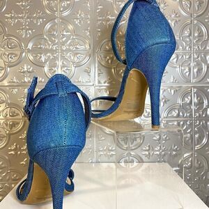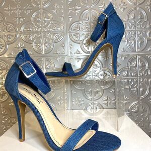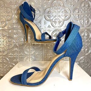 Your search ends at the Enzo, for the perfect little blue heel! The Anne Michelle Enzo 01N Blue Denim Single Strap Heels keep it simple with a skinny toe strap in blue denim, paired with a sleek heel cup and ankle strap that adjusts with a silver buckle (and hidden elastic). Strut your stuff with a 4.25" wrapped stiletto heel on a single sole. Cushioned insole. Nonskid rubber outsole.