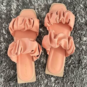 Circus by Sam Edelman®. Soft and lightweight, these ruffled sandals will bring some fresh attention with a touch of softness to your look. With square detailing and straps ruffled to the max, these slip-on sandals are anything but basic. Synthetic faux-leather upper, with ruched straps across the upper and vamp. Synthetic lining and insole with croc-embossed toe. Malibu peach color. *Brand new without original box. Authentic brand