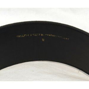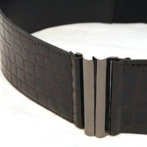 This is a nice 12th Street by Cynthia Vincent belt. This belt is made of leather with an embossed croc pattern with a stretch insert at back and metal clasp at front. This belt measures 30" long by 3" wide and is marked as a size medium. This belt is brand new without the tags.