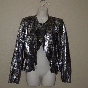Leather jacket in a metallic silver reptile print, two hook-eye clasps on the waist, made in France and dry clean only,