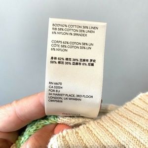 Shell: 62% cotton, 38% linen Rib: 58% cotton, 35% linen, 6% nylon, 1% spandex