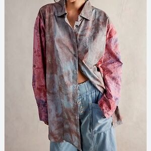 Too-cool in a colorful fabrication, this button-down from the We The Free collection is featured in a dyed design and oversized fit with a collared neckline and slouchy cuffed sleeves. Fit: Slouchy, oversized fit