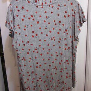 From JoySpun: This set is new without tags. Size Large both top and bottom. Rayon/spandex blend. Very soft and silky knit. Heathered gray background with painted lady bugs all over and the words "Love Bug". Top features round neckline and short sleeves. Bust measures 44" and length is 27". Wide leg pants have elastic waist and pockets. Waist measures 35" and stretches to 44" and inseam is 24". 35" from top of waist band to hem. Very stretchy and in new condition. Took the tags off and placed in a drawer. Never got to wear them before my weight loss.