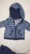 Top is long sleeve, full front zip, hoodie, navy/light blue stripes throughout, velour, 2 front pockets & size 0 - 3 months.