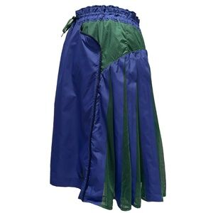 Sacai is known for fresh takes on traditional silhouettes punctuated with a fun feminine flourish; in this case Chitose reinterprets Nike's heritage Windrunner as a skirt. Featuring traditional windbreaker materials, mesh and ripstop nylon create a paneled skirt with accordion pleats in bands of green and blue. The skirt is fully lined.