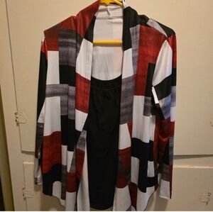 Refresh your wardrobe with this stylish and versatile two-piece set, perfect for any season! This set includes a size medium black tank top and a striking long-sleeve cardigan. The cardigan features a bold, eye-catching geometric pattern in black, white, and red blocks, making it a standout piece.