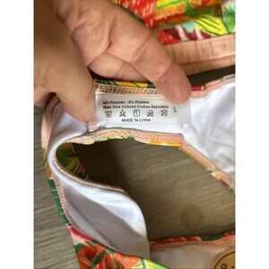 Cute set with a PG pink ground, bright tropical colors, and the Song features white fringe. See photos for how the bathing suit fits. The bottoms are pretty low rise and quite cheeky. Never worn, still has the bikini bottom paper lining.