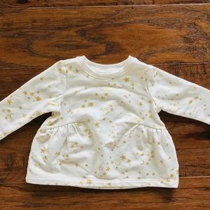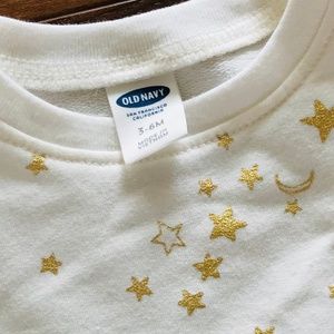 This adorable set is NWOT, it has never been worn. This set includes a cream-colored sweatshirt that is fleece-lined w/gold start detail, as well as dark demin jeans w/an elastic waistband.