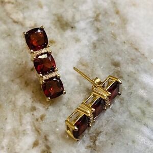 Stunning $399 Stauer Cabernet Garnet Three Stone Cushion Cut Drop Sterling Silver Gold Finish Classic Earrings: