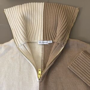 NWOT Women’s shaker knit bi color, 1/2 zip over sized sweater. Features gold tone zipper, ribbed turtleneck collar, drop shoulder, rib knit sleeve & side vents. Off white & light brown front & back of sweater.
