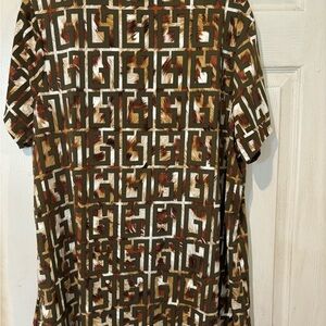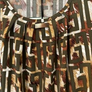 A unique Greek design in olive color with shades of tan and brown in the background. Goldtone bar on front neck line. Pit to pit 26”