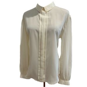 Step into the elegance of the 1980s with this beautiful cream blouse NWOT by Foxcroft Women, featuring intricate front pleats and a delicately embroidered eyelet lace collar. The back button closure adds a touch of made in Japan vintage charm, making this blouse a standout piece for any wardrobe.