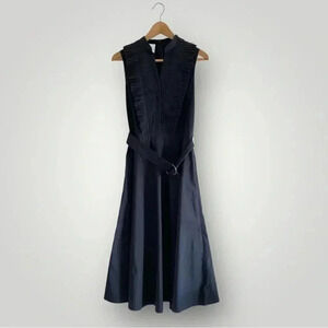 NWOT AKRIS PUNTO Plisse Cotton Midi Belted Dress Navy Blue Sz 6