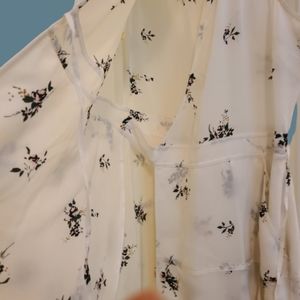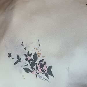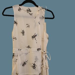 Sleeveless summer dress. Cream with floral (muted pink, charcoal grey, black, tan).