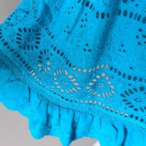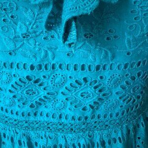 Absolutely stunning dress! Features v-neck front and back adorned with matching eyelet fabric, back zipper closure. Fully lined. Fabric: 100% cotton. Perfect for a special occasion or wear with a denim jacket and sneakers as a casual piece! Perfect condition, just tried on and it’s too small for me. Tag fell off.