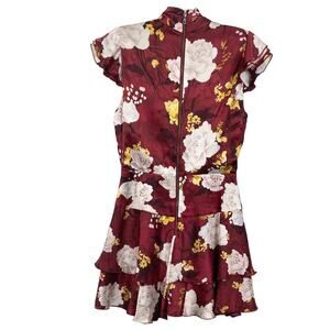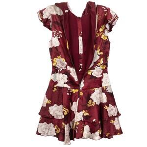 Sold at Modsense, Neiman Marcus, Nordstrom, and Revolve. Tie neck, tiered ruffle cap sleeves. Concealed front button closures. Seamed waist. Tiered ruffle hem. Exposed back zip. Hook and eye closure. Textured finish on print. Lined. Extremely soft. Pearlescent crepe fabric. Style number is CC808P10507. Color is water lotus bordeaux. Ladylike, demure, feminine. All season. Fits true to size. Celeb favorite. Worn on the red carpet & tv shows. Maroon color. 494
