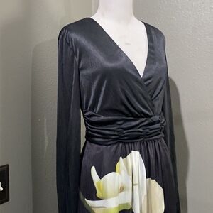 Style yourself a simply sophisticated look you can don for a wedding or any formal occasion with the Floral-Print Long-Sleeve V-Neck Maxi Dress from Altuzarra for Target. A solid black color makes for a sleek and elegant look, and this V-neck maxi dress gets an artistic touch from bold white florals blooming from beneath the waistline down to the hem. Ruching at the front creates a figure-flattering silhouette, coupled with a flowy fit for beautiful movement and comfortable wear. You'll love the alluring touch of a thigh-high slit that makes this dress ideal for showcasing an eye-catching look for your next special soiree.