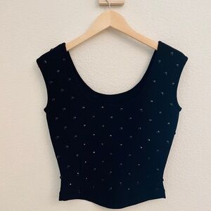 ANDREA JOVINE vintage holiday black sleeveless cropped jewel beaded top with rounded front and back collar. Faceted, large black plastic beads embellish the entire top, both front and back (no beads missing). Size: Extra Small (runs large- more like Small fit) 100% Merino Wool. Condition: NEW and UNWORN (no tags).